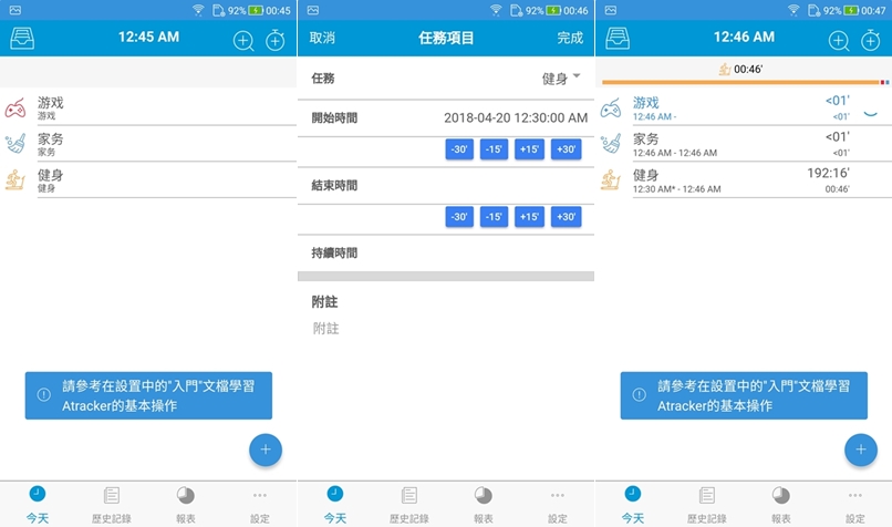 沒有時間觀念、又想好好規劃的人一定要使用任務管理程式,選擇任務項目後再調整開始、結束的時間,就可以去做事了,APP 會幫你計算花了多少時間。