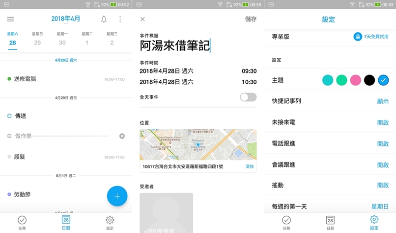 優點是可以同步 Google 行事曆,在 APP 儲存的事件也能設置時間、地點、位置,或邀請其他用戶加入,尤其電話和會議的管理功能很適合大三大四以上,常要跟教授開會的學生,一定要記清楚不然畢業很危險啊。