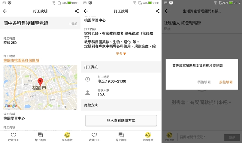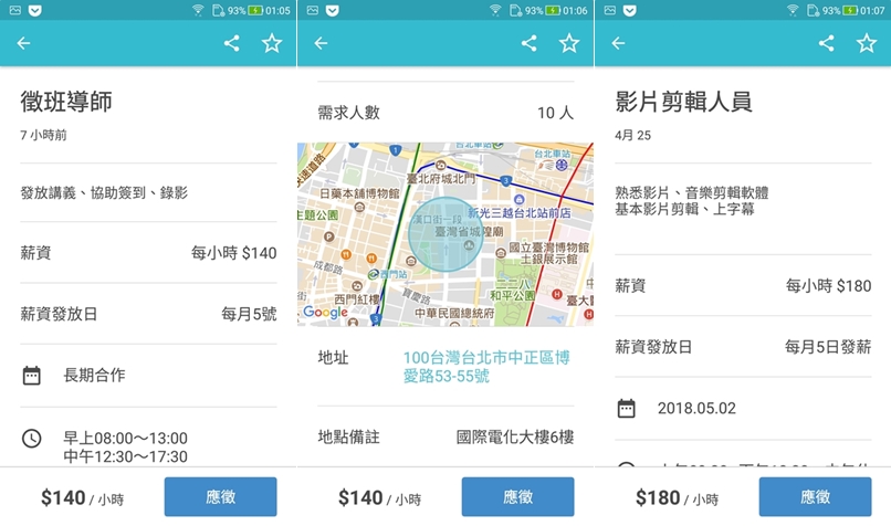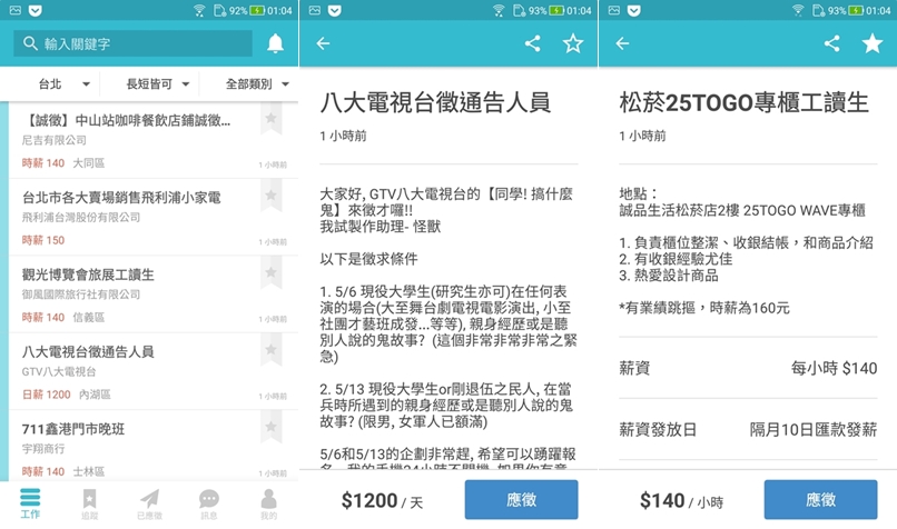 看了好幾個內容都很清楚,基本的工作內容、地點時間、性質等都會寫清楚,有的也會有位置圖,單日、多日、長期等各種類型都有,如果急著找打工、網路上又找不到的話可以試試看用 APP。