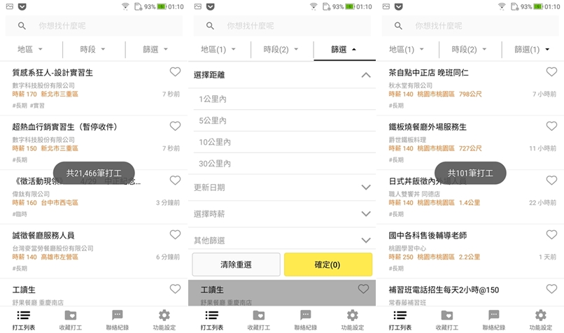 這款收集的資訊也很豐富,不分類就有 2 萬多筆,可再經由地區、時段、距離、時薪等其他方式篩選,喜歡的就點愛心收藏。