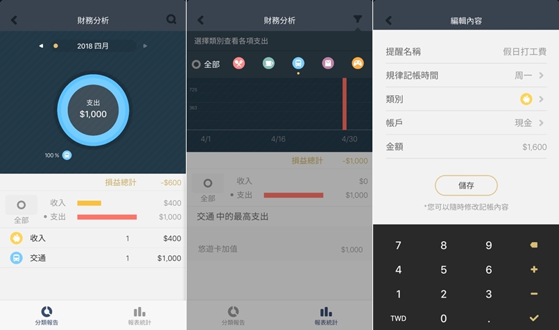 將一筆筆收入、支出分類並記錄下來,還會幫你分析損益,可以選擇圖表並切換各種類別查看,有了明確的統計報表才能做好理財規劃,固定的收支還能特別編輯,像是每個月都會進帳的打工費用就可利用這個方式存取。