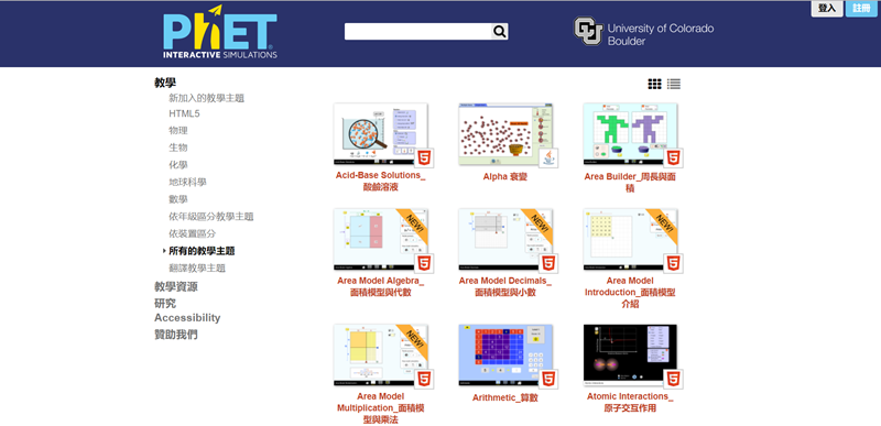 來看一下所有主題,包括化學公式、數學模型、物理定律及各項實驗都有,可從左邊分類進入,或選擇查看其他資源。