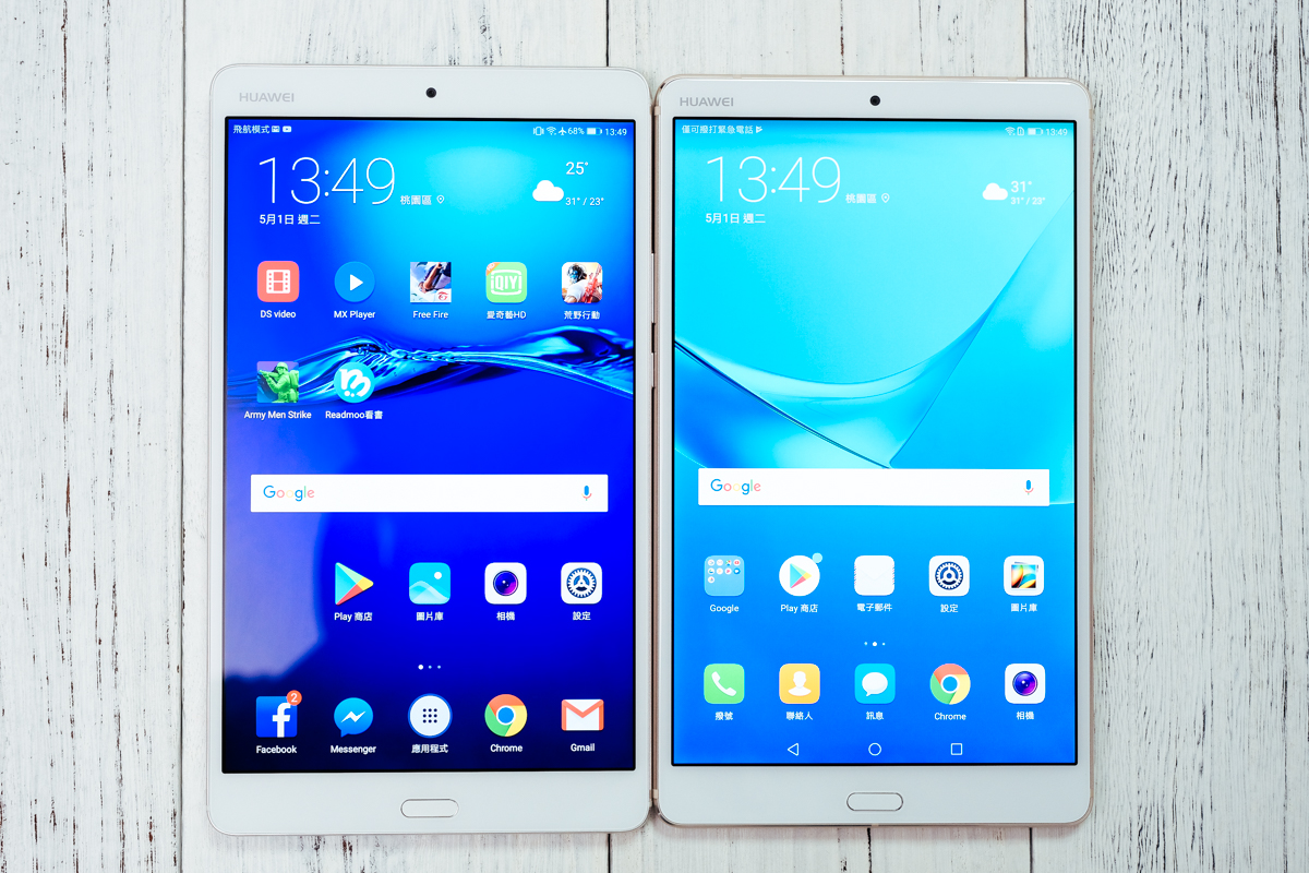 順便秀一下阿湯自己現在正在服役中的 MediaPad M3(圖左),真的蠻好用的,同樣是 8.4 吋,不過可以看的出來外觀在 M5 的設計上又再略微的縮小一些,且在邊欄的設計上更加的圓潤好握,基本上 M3 升級到 M5 還是相當有感的,讓我一直左手打右手不知道要不要換啊...