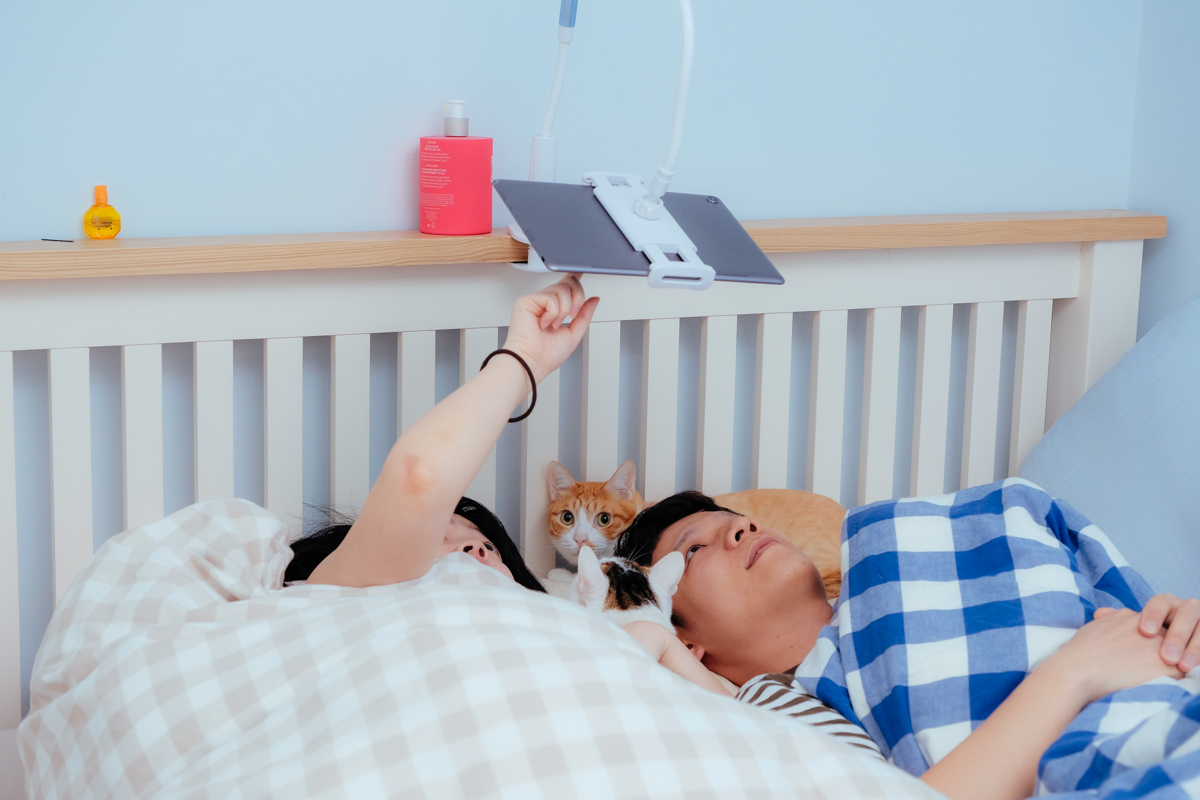 雖然平常追劇、看電影會在客廳用大電視然後廢在沙發上,不過有時我們會換換場景,直接躺在床上廢,至於到底有多廢,請大家看 VCR(誤)。不過 10.8 吋 Wi-Fi 版的四組 harman kardon 揚聲器聲效真的很棒,在小臥房中一整個很有環繞效果。