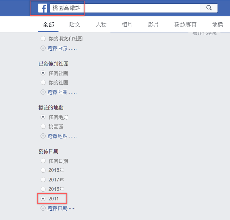 假設是 2011 年關於「桃園高鐵站」的貼文,還能進階設定幾月幾號,相當詳細啊。