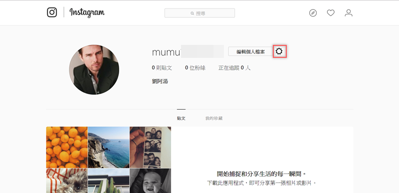 登入 IG 後,到個人檔案頁面,點開那個齒輪圖示。