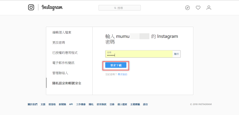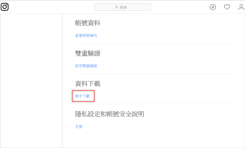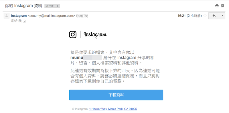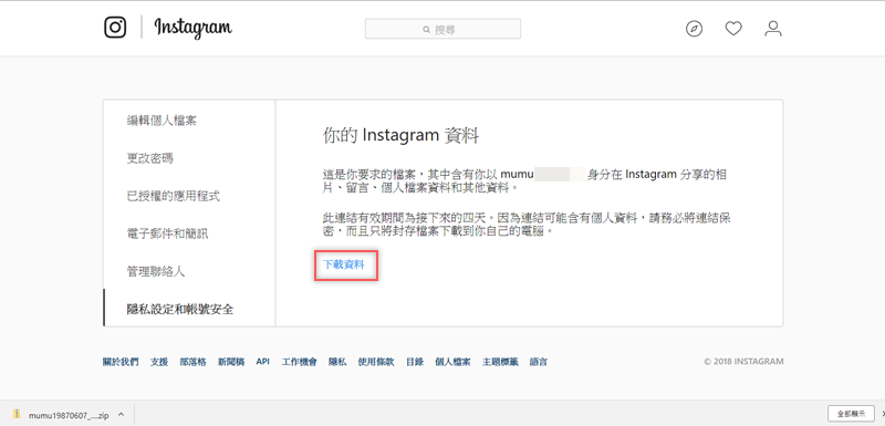 按下載資料後會連到 IG 頁面,再按一次就會自動儲存壓縮檔案,這裡的檔案都是你編輯過的,像是照片的濾鏡效果或剪輯過的影片都會照實保留處理過的樣子。