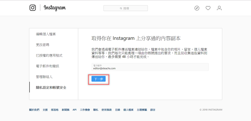 系統將打包你的相片、留言、個人檔案等資料,並傳送電子郵件連結給你,依照資料多寡最多需要 48 小時完成。