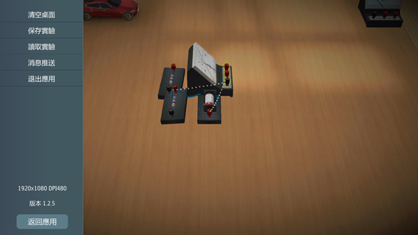 依照要進行的電路種類將底下提供的元件拖進去,像是直流安倍表、定值電阻、電池等,再點接頭連線即可,顏色可調整,因為對電路實驗沒什麼概念(忘了…),所以阿湯是照著 APP 介紹提供的圖片來擺設。