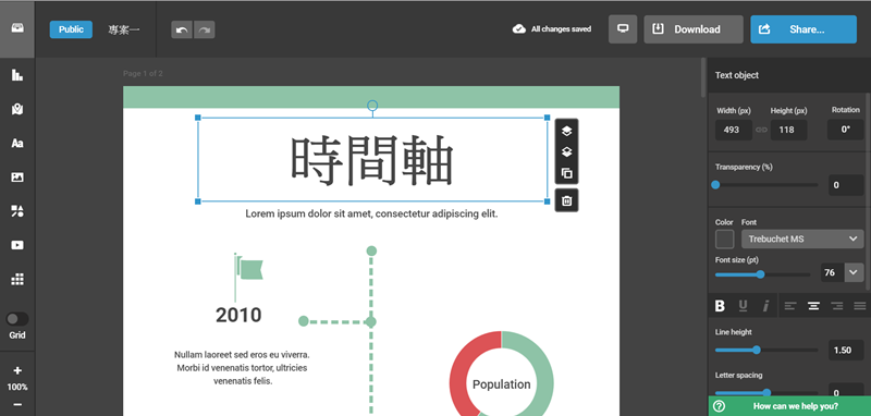挑個黑暗模式的時間軸來編輯,如果用過類似的線上工具就會很熟悉,點選物件右欄就會顯示可以調整的內容,以文字來說就是大小、字體、行高、間距、顏色及透明度等細節。