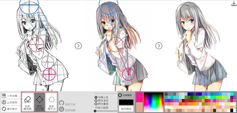 工具就是紅框裡的那三種,任意選擇顏色後利用「顏色定位器」,點在線稿上想要上色的地方,如左圖,阿湯就隨便加入了六個定位點。