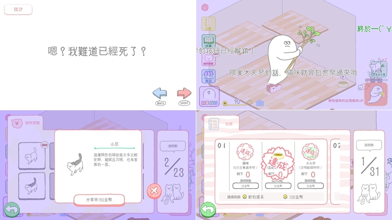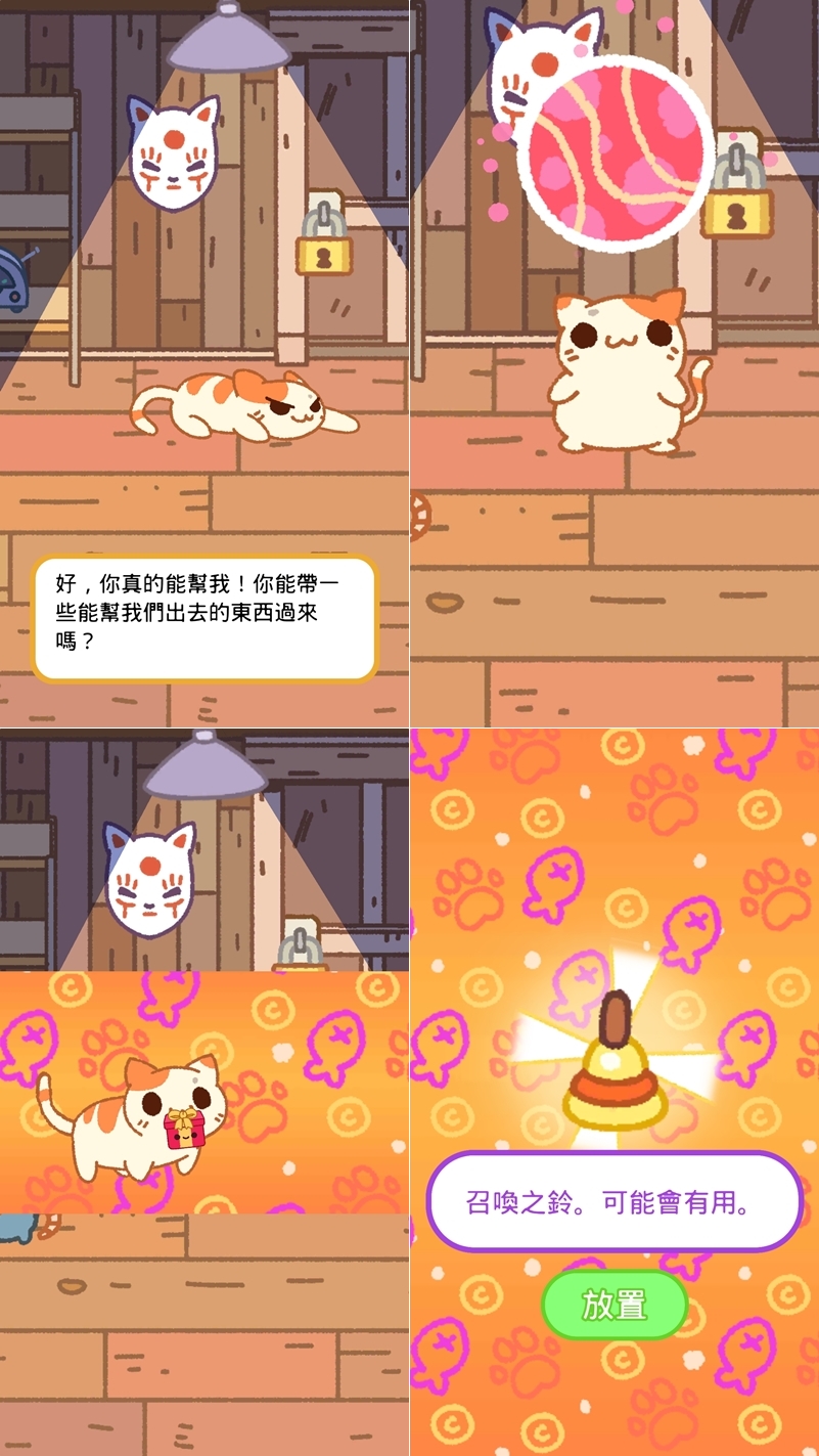 日式風格的 APP,畫面也是舒適的插圖感,敘述一個不知道為什麼死掉的幽靈與老家貓咪的日常,貓咪會在房間角落排隊,放置食物讓貓咪來吃,收集錢幣、道具來完成任務。