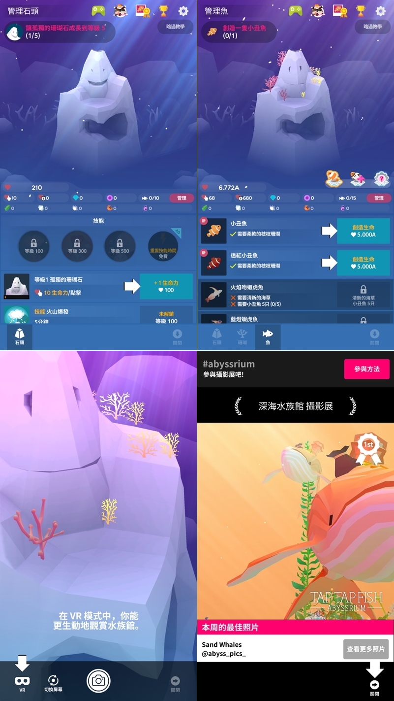 跟上一款一樣是利用點擊畫面紓壓並增加經驗,來換取魚類及布置物品,除了增加生命力,像是珊瑚還會有火山爆發的技能,支援 VR 模式讓你可以在 3D 環境中接觸海底生物,音樂也很好聽建議開著玩,或是拍張照片加入攝影展與其他玩家分享。