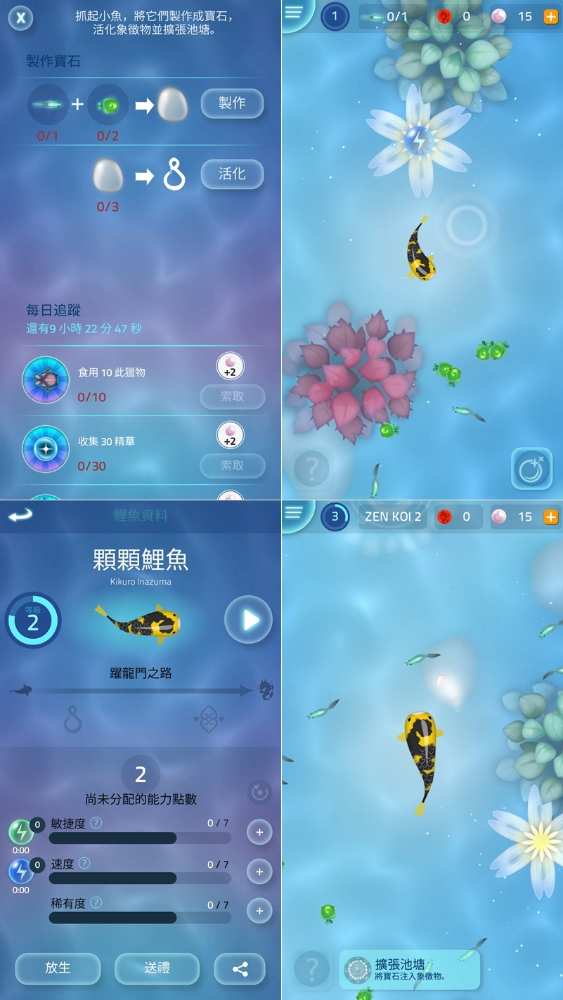 中文叫鯉魚禪,這是系列的第二款,差別在於升級可以增加龍之領土和魚池,藉由吃其他生物來合成寶石,收集珍珠等精華來解任務並提升能力指數,可愛的鯉魚們最後會變身鯉魚王,畫面很精緻漂亮,搭配禪風音樂真的有療癒效果。