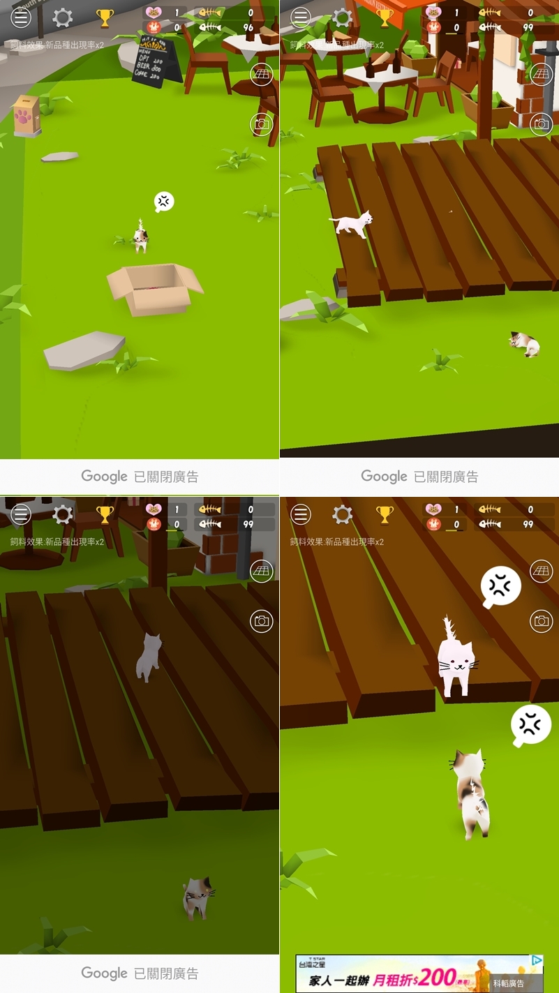 有趣的是你沒辦法控制貓咪要去哪裡,像阿湯第一隻貓就失蹤找半天最後發現在角落路睡著了,貓咪之間也會互動,下圖就有炸毛互嗆的畫面,而且會自動變換白天黑夜,貓咪眼珠也會變色,真的是生動又可愛。