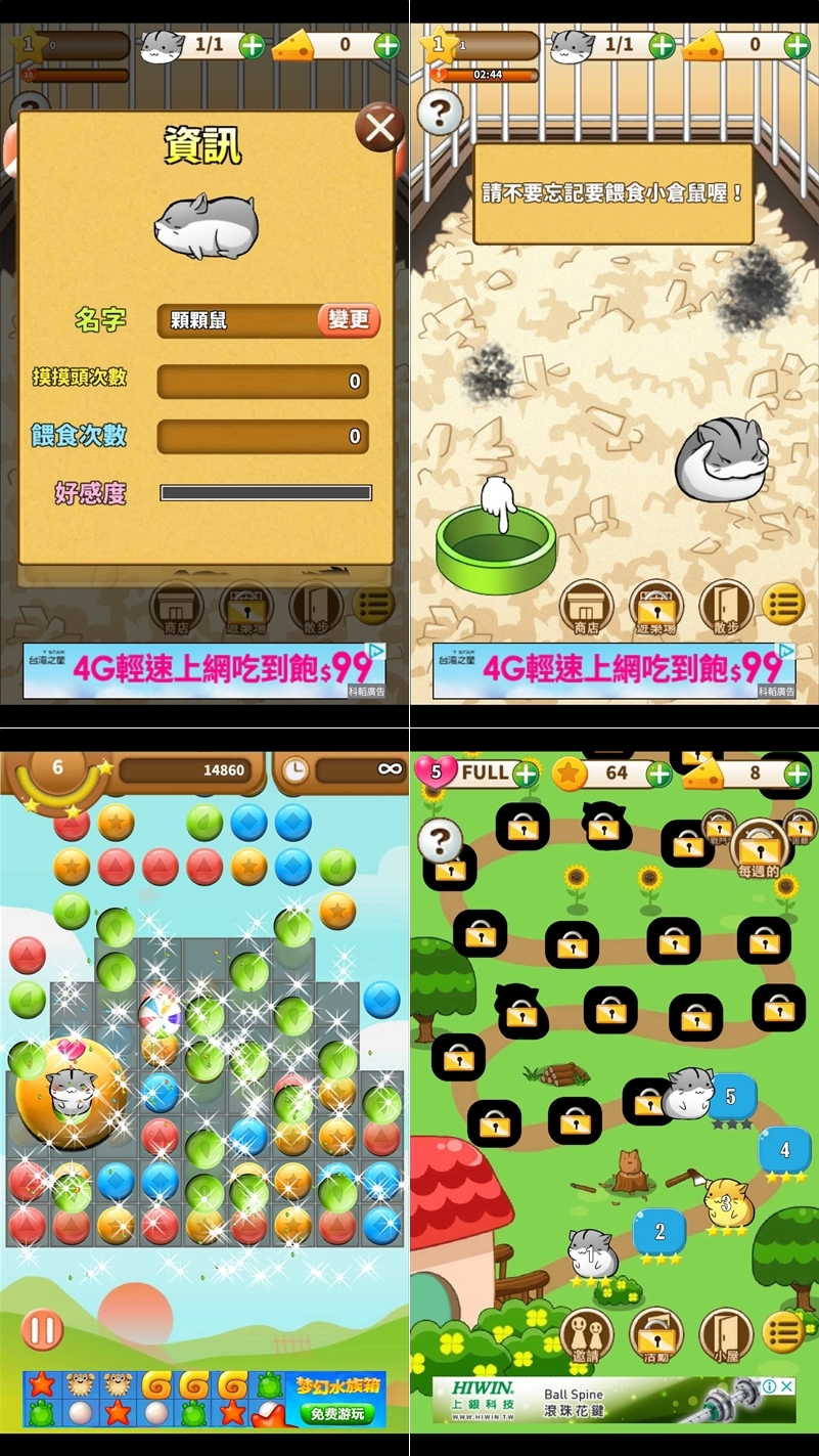 養過貓跟魚接下來養倉鼠,這款除了養成還可以玩消消樂,平常就是餵食打掃摸摸頭,抓著牠移動,累積硬幣和經驗值,擺放設施讓倉鼠去玩,各種動作及表情也是很可愛,可手動增加倉鼠數量,升級關卡也會隨機出現新品種,簡單又紓壓。