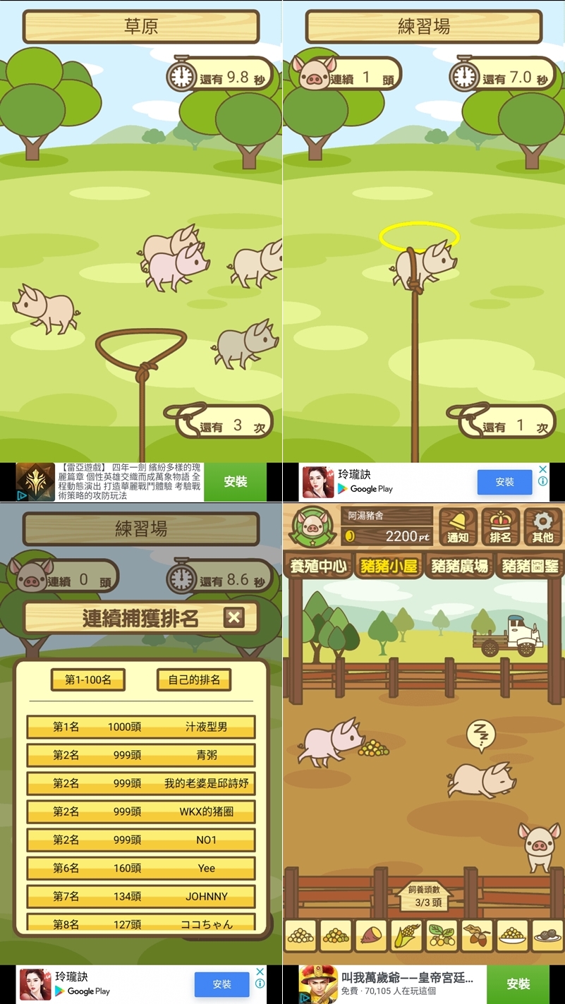 舊版養豬場可能有人玩過,不過出了新版舊款就沒在升級了,共 168 個品種屬性也不同,進貨後可查看體重及放牧等細節,看廣告可獲得養成提示,平常就丟食物進去餵食,到處狩獵豬隻或配種收集圖鑑。