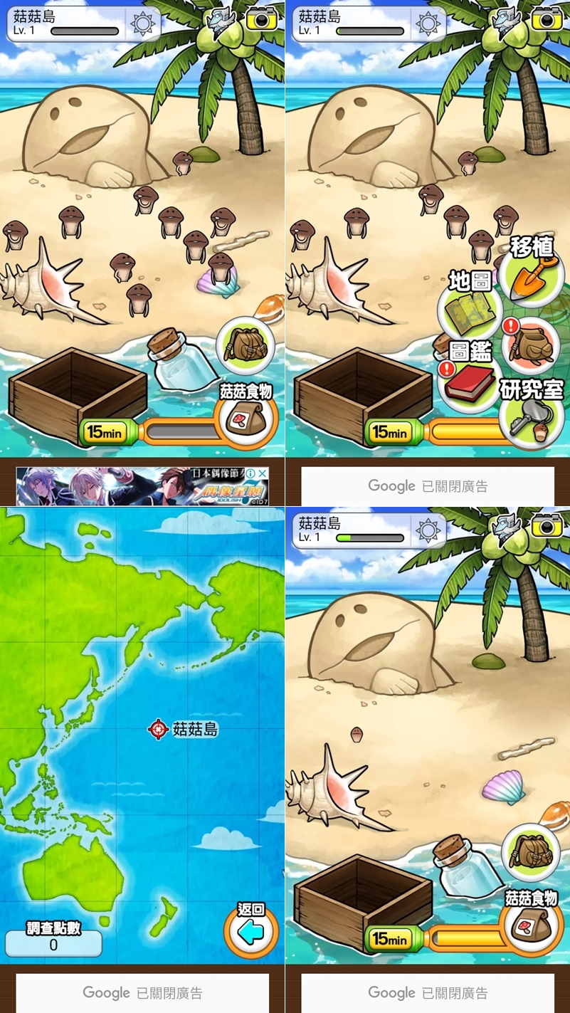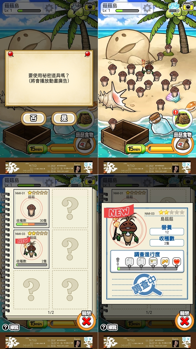 等不及的話可以看廣告取得秘密道具,使用後就會瞬間長成一片,有密集恐懼症的朋友應該不太適合這款...當然也是有圖鑑功能,隨著調查進度可以取得更多資訊,一起集滿圖鑑成為菇菇博士吧。