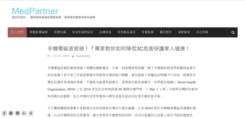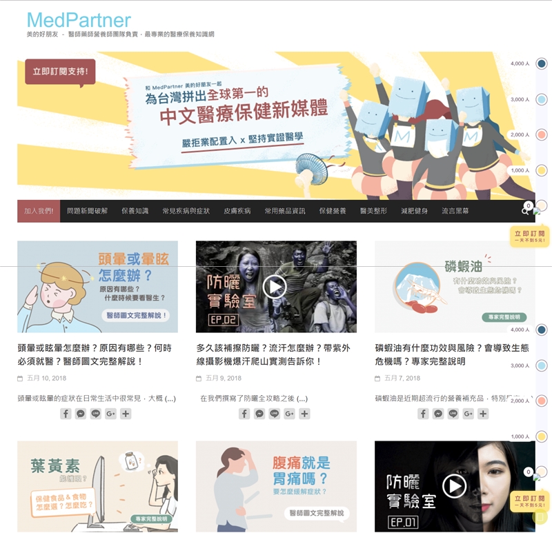 MedPartner 又稱美的好朋友,首頁可瀏覽最新文章,或選擇從新聞破解、保養知識、常見疾病、藥品資訊等分類進入,阿湯看了一下大概兩三天就有一篇,網站因為拒絕業配置入及堅持實證醫學,如果有需求可以訂閱支持。