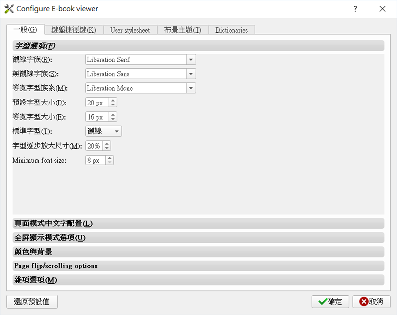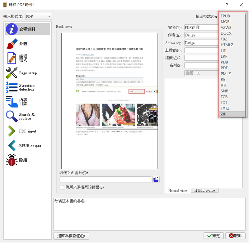 設定輸入及輸出的格式,共支援 18 種格式,封面照片、書名、作者及出版者也能依需求變更。