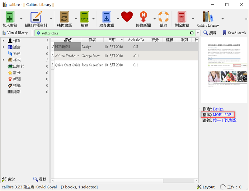 阿湯轉成 MOBI 檔,可以看到文件格式除了 PDF 外多了 MOBI,如果要使用 Calibre 當作閱讀工具,建議還是轉 ePub 比較方便。