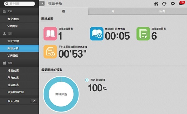 而閱讀分析裡,可以查看自己的閱讀習慣、喜好等,藉此來為自己定制每月閱讀目標也是相當不錯,可以讓自己從強迫閱讀變成一種習慣,但阿湯本來就有這個好習慣,沒有這樣的困擾呀。