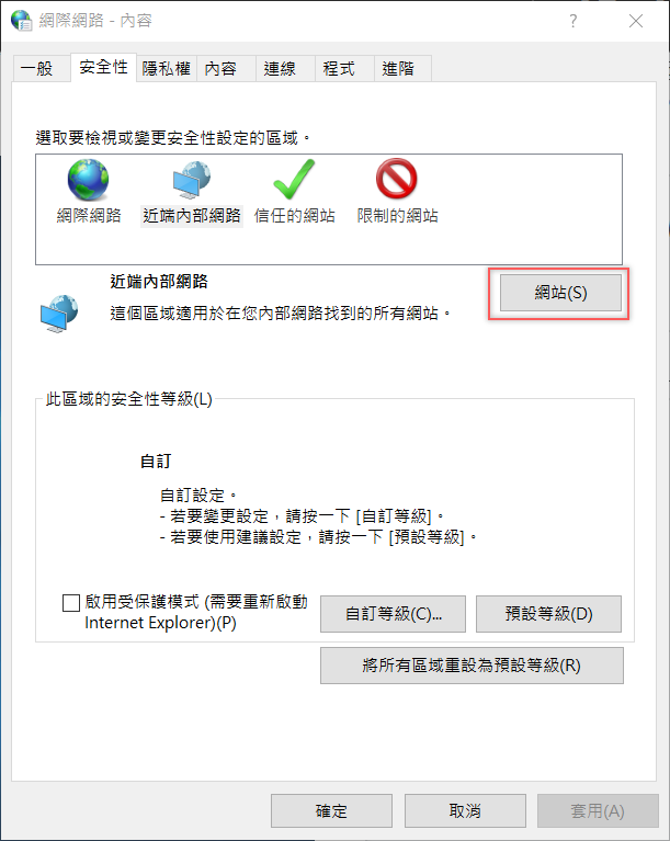 切換到安全性這頁,看到進端內部網路旁邊的「網站」,點進去。