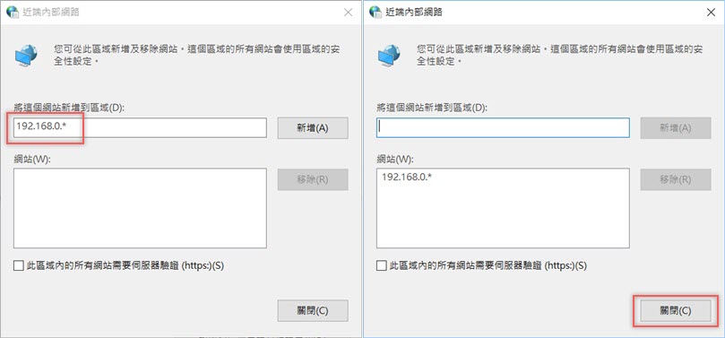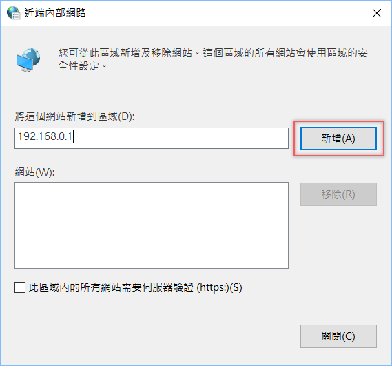 接著就來輸入設備的 IP 位址或 DNS 名稱,有點類似白名單的概念,這區的所有網站都會套用到區域的安全性設定。