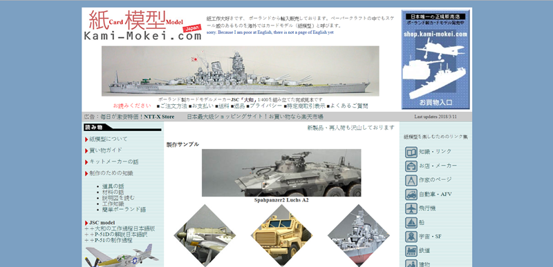 各種軍事用品及交通工具,也有電影和動畫系列的相關內容,像一些機器人或非現實世界的器材等等,並提供 PDF 格式的材料及組裝說明,有的項目也有影片教學,最新的是製作 JR 列車模型的示範短片。