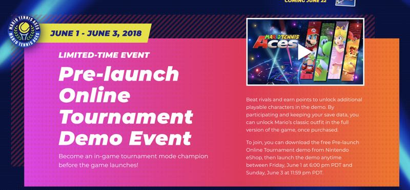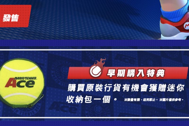 Nintendo Switch 今年備受期待的大作之一 《瑪利歐網球 Mario Tennis Ace》雖然要在 6 月 22 日才會正式開賣,但稍早於台灣任天堂官方網頁已經出現開放預訂的消息囉!除了公布台灣的上市日期,也透露日本以及美國的 eShop 能夠讓玩家免費下載這個遊戲的線上競賽活動,並且在 6 月 2 日至 4 日期間能夠搶先體驗!