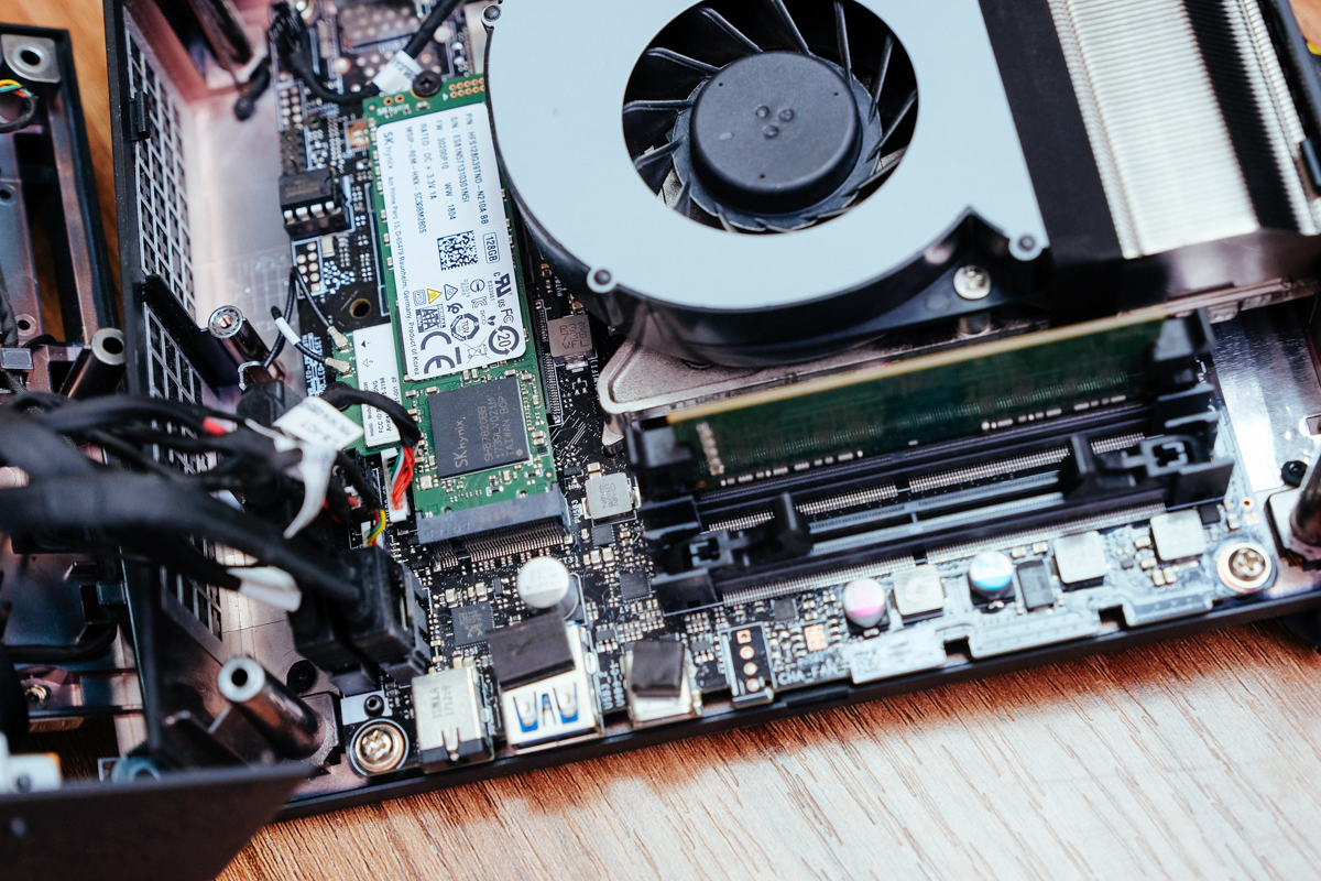 打開後就可以看到原本安裝的 m.2 PICE SSD 以及右下角的二個記憶體插槽,咱們就先一一的先拆下吧。