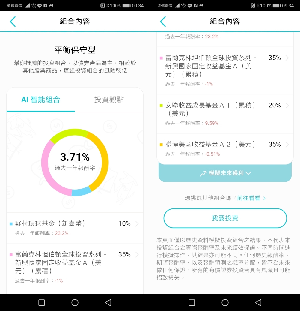 像阿湯果不其然的就是屬於保守型的,所以推薦給我的組合是報酬率較低的,但意思應該是相對也不至於會大跌之類的組合。