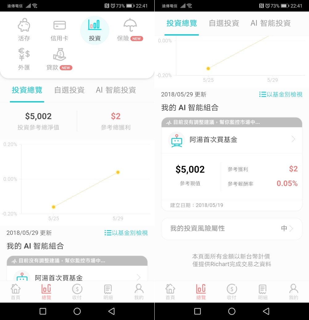 台新 Richart APP 前陣子在投資這一區塊中再推出了一個叫做「AI 智能投資」的新功能,稍稍研究了一下,這和先前推出的自選投資組合是不同的,主要透過主要透過人工智慧預測市場及你的理財風格來推薦適合你的投資組合,不需要自己花大把時間研究,阿湯人生中的首次基金購買就獻給了 Richart 了。