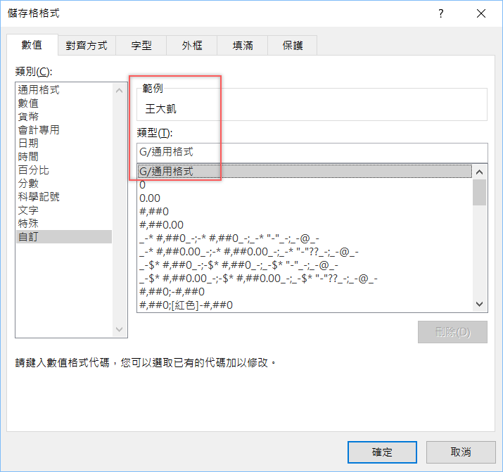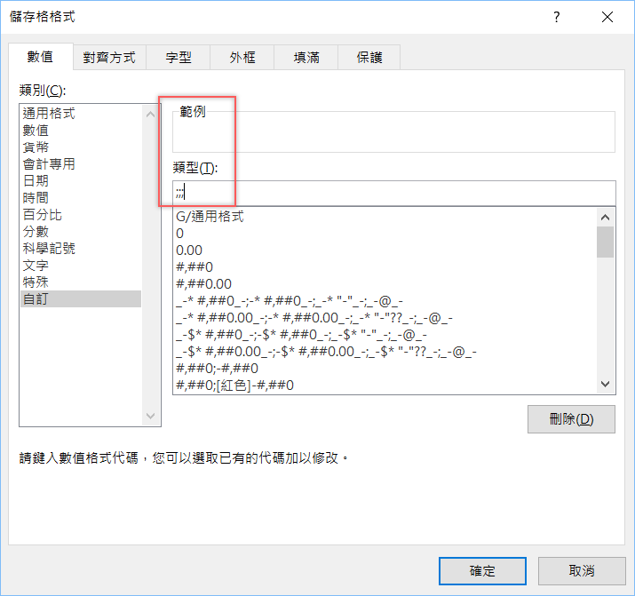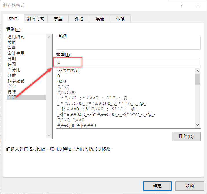 找到最底下的自訂,輸入類型「;;;」,就是三個分號,按確定。