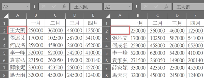 針對不同的儲存格內容與格式,阿湯再舉一個例子,現在 B2 這一格的內容一樣要變成空白,而且這一格是有套用公式的。