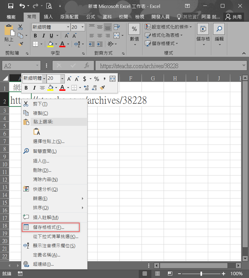在 A2 按右鍵 → 儲存格格式。