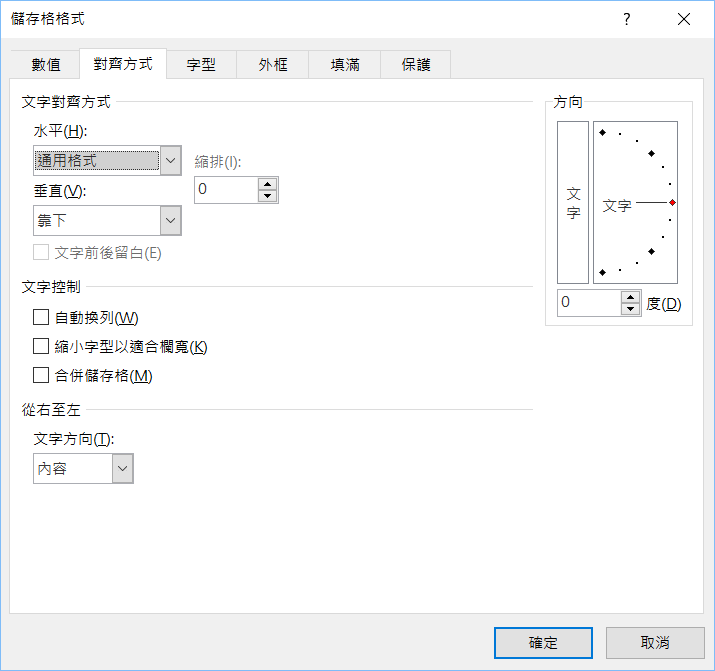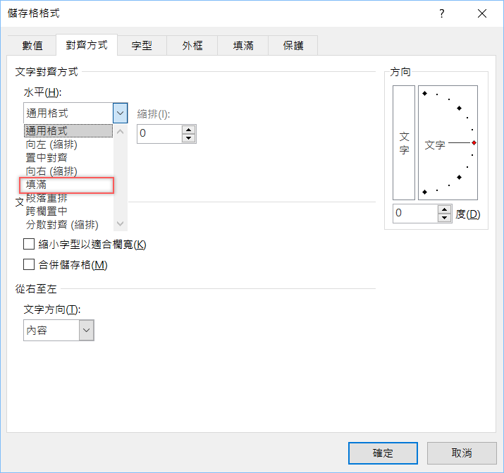 出現視窗後切換到對齊方式,在水平的下拉清單選擇「填滿」。