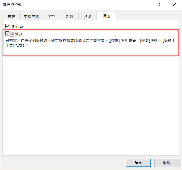 切換到最後一頁「保護」,將「隱藏」這項勾選起來,提示你還要設定保護工作表,這個功能才會起作用。