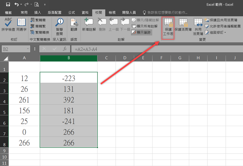 切換到校閱,選取要隱藏公式的儲存格後,按下「保護工作表」。