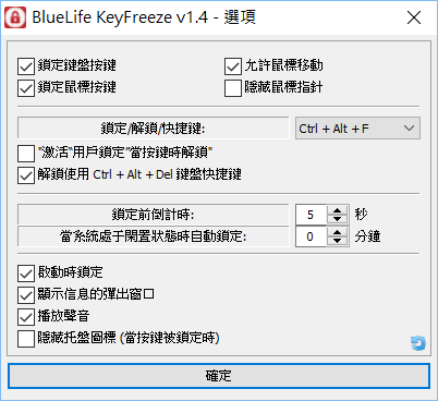 可以取消勾選不需要的功能,或更改快速鍵(Ctrl+Alt+自訂按鍵),倒數秒數、閒置多久自動鎖定、要不要音效等,可以調整的地方還蠻多的,用用看。