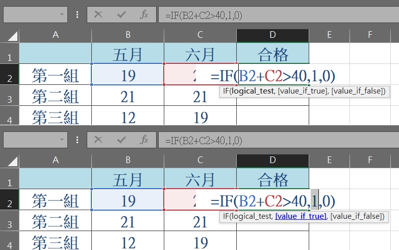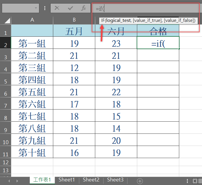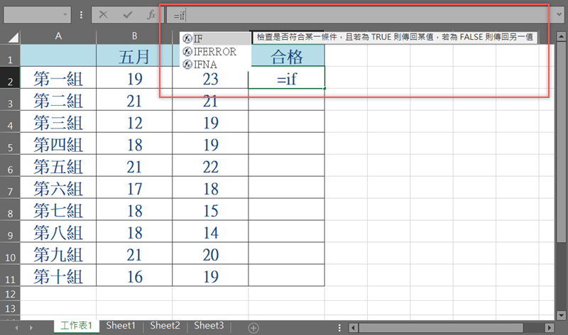 假設儲存格 D2 要使用的函數是 IF,在編輯列輸入「=if」之後會出現相關的功能說明,到這邊大家應該都知道。(IF 函數示範請參閱