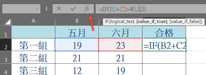 再將算式往下複製結果就都出來了,以範例來說就是如果五月加六月的數字大於 40,再合格欄位就顯示 1,否則為 0,如果對 IF 函數不熟悉的朋友再回去看阿湯的