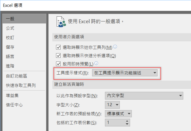 正常來講介面上都會出現提示,如果你沒有出現的話,就到選項 → 一般,找到工具提示樣式,選擇「在工具提示顯示功能描述」就 OK 囉。