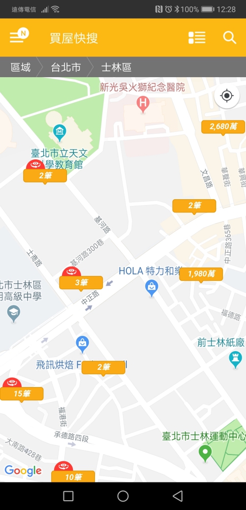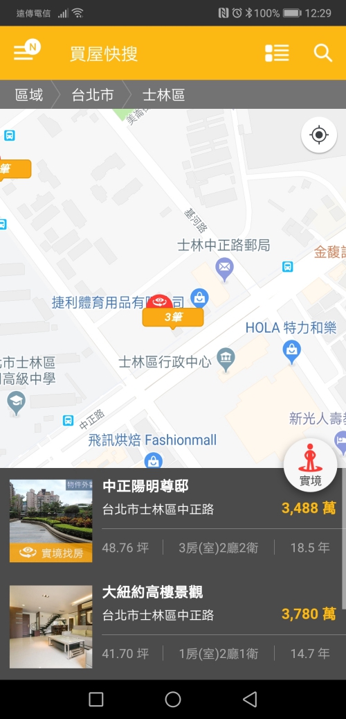 預設也會以地圖的方式來呈現並顯示有房屋的位置,讓你很直覺得依自己想買的區域快速初步的篩選房屋。