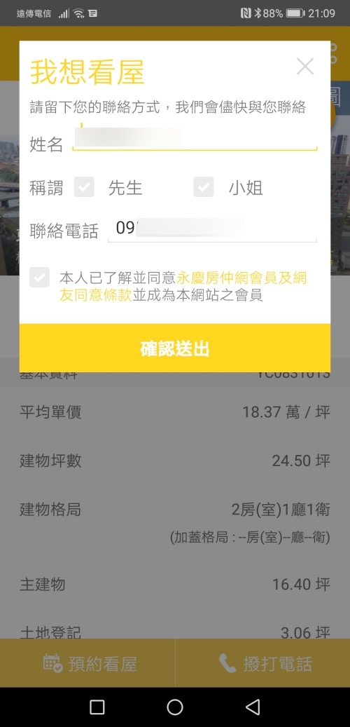透過永慶快搜 APP 的一番篩選查看後,真的有想要看的房子也不用自己聯繫,直接點擊預約看屋填寫聯絡資訊就會有專人和你聯絡,連電話費都省了....