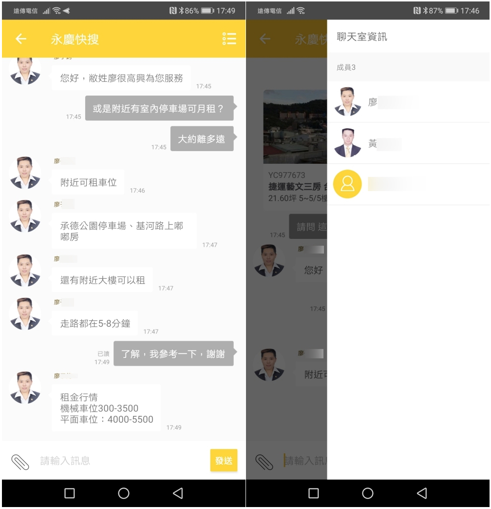 除了桃園的房屋之外,其實平常我們在台北工作之餘也會看一些在台北的房屋。因此阿湯也找了一間台北永慶直營店的房屋詢問了一下,因為沒有含車位,所以我就詢問了停車場相關的問題,回覆速度神快,1 分鐘內就回覆我,而且我還沒有問的很細,經紀人立馬還提供了各種資訊給我,服務真的是很棒。另外,每個房屋都會有店長與案件負責經紀人一起服務,所以基本上發問都不需要等太久,很快就可以得到回覆。