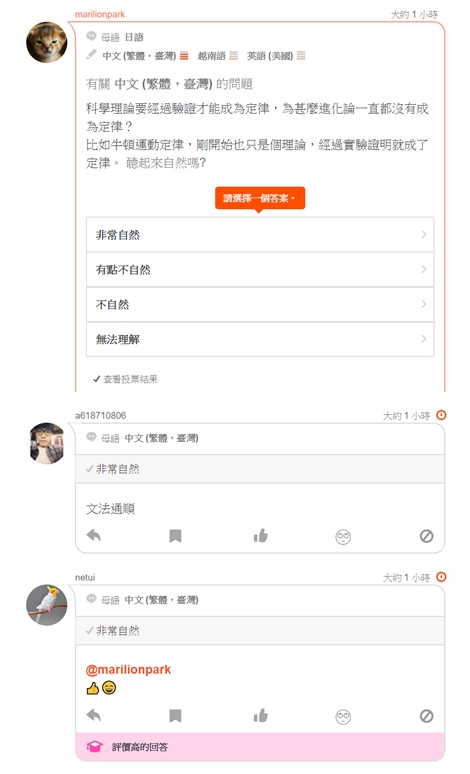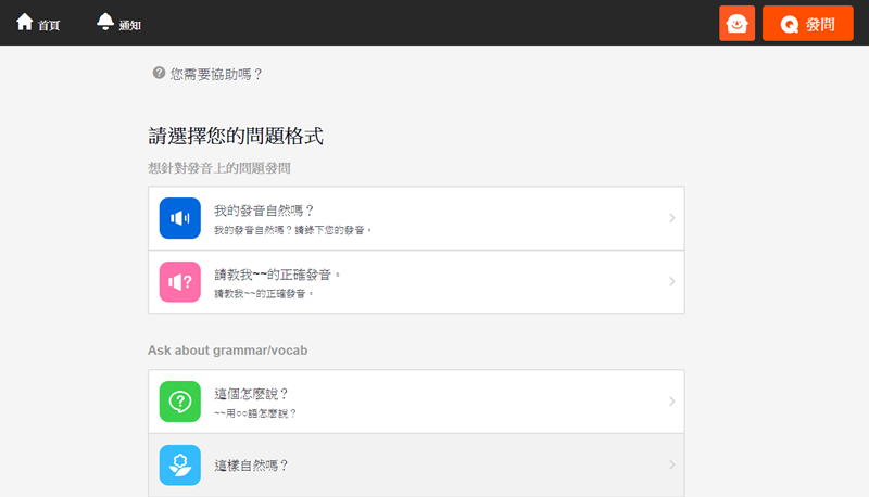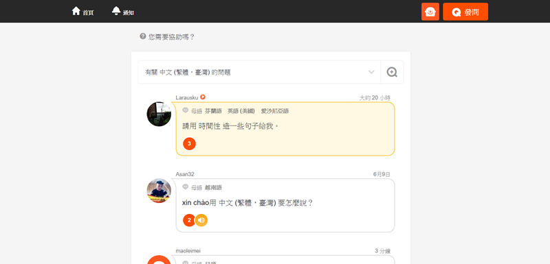 選擇自己的母語、正在學的語言、感興趣的國家,下一步就會先進入目前有的Q&A 頁面,可以看到不同母語的人對繁體中文(台灣)所提出的相關問題,像是翻譯、造句等,底下顯示的數字是目前的回答數。