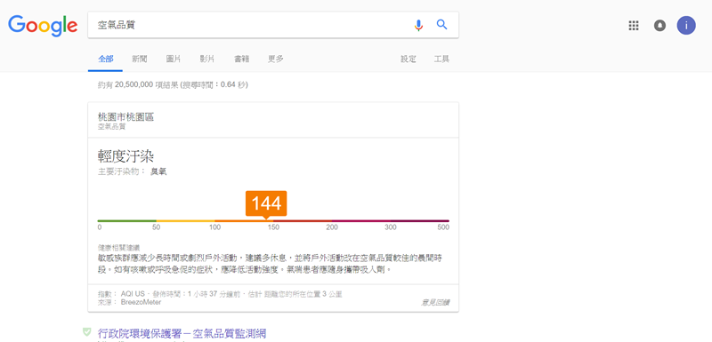 最簡單最快的方式就是用 Google 搜尋,開啟瀏覽器輸入「空氣品質」即可,會顯示你目前位置的汙染程度,以及戶外活動相關建議。