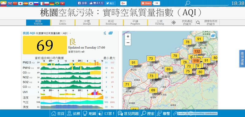 主要以 AQI 指數配合顏色來顯示即時狀態,並提供過去 48 小時的數據圖表,包含 PM2.5、PM10、溫度、氣壓、濕度等,如果想了解細節、加以比較的話應該很有幫助。