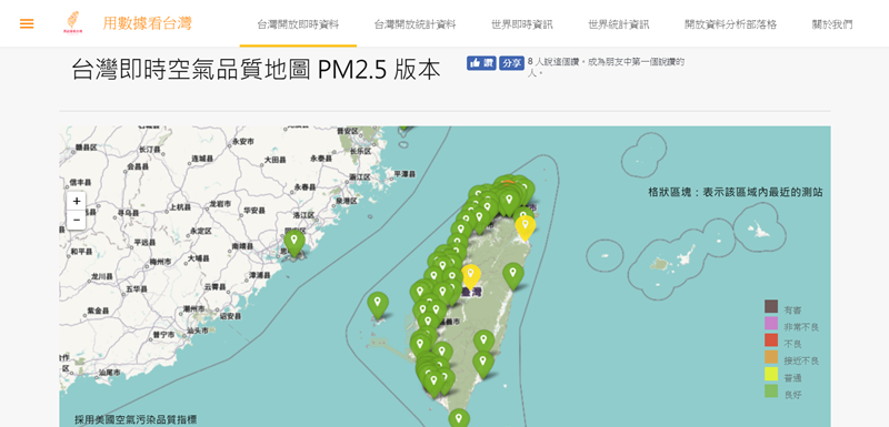 提供即時空氣品質地圖,可放大縮小瀏覽,還能切換到世界即時資訊,或統計結果來查看,不過跟其他平台比起來汙染好像沒那麼嚴重?綠色的地方多很多,應該跟採用的是美國空氣汙染品質的指標有關。